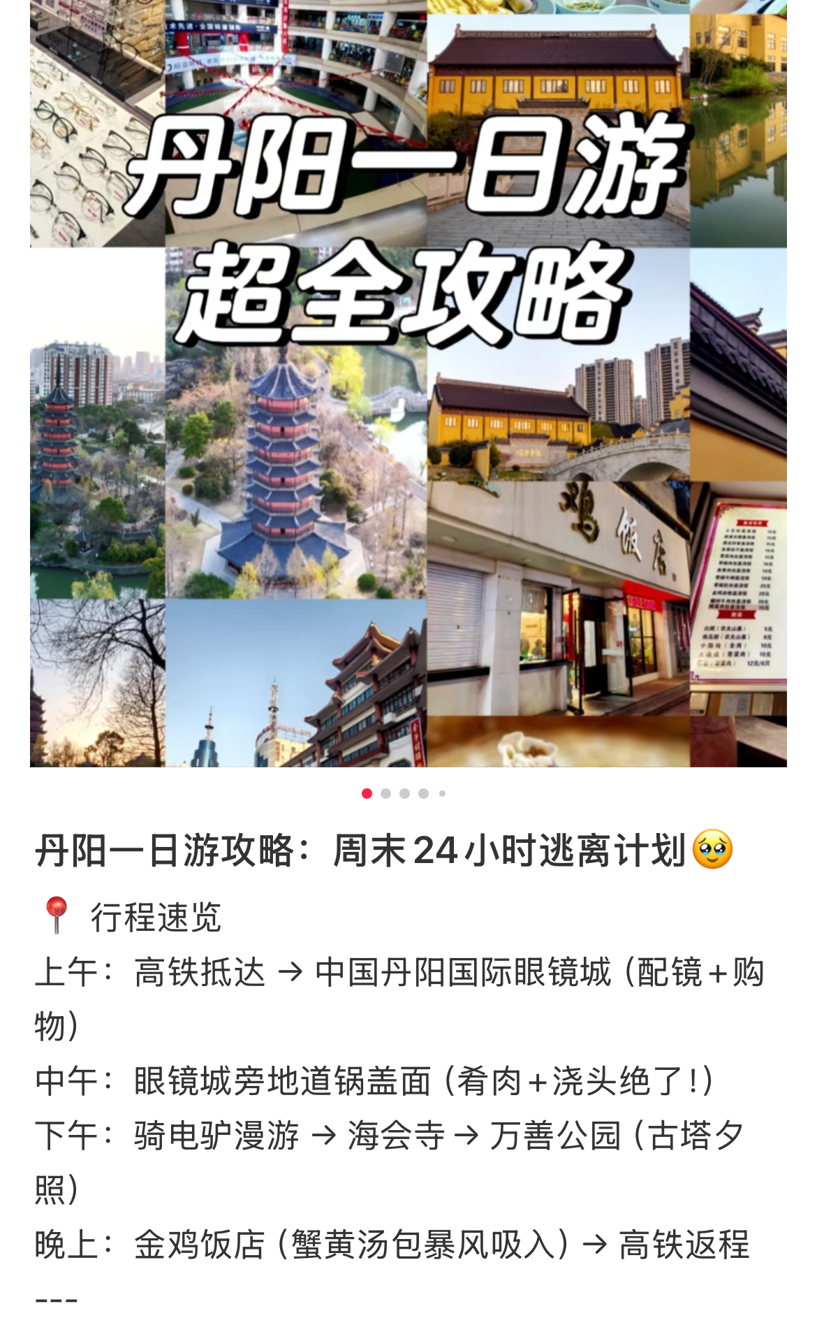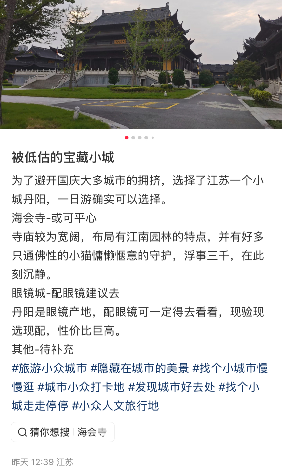 我的丹阳讯(记者 宦珅婕 吴阳芳)国庆假期,大家都想趁着放松一下,又想出门旅游,又怕高速堵车。其实在丹阳玩转一下也不错,近日,很多外地人在社交媒体发布了来丹阳旅游的感受,也有很多博主发布丹阳旅游一日游攻略,纷纷得到了好评。